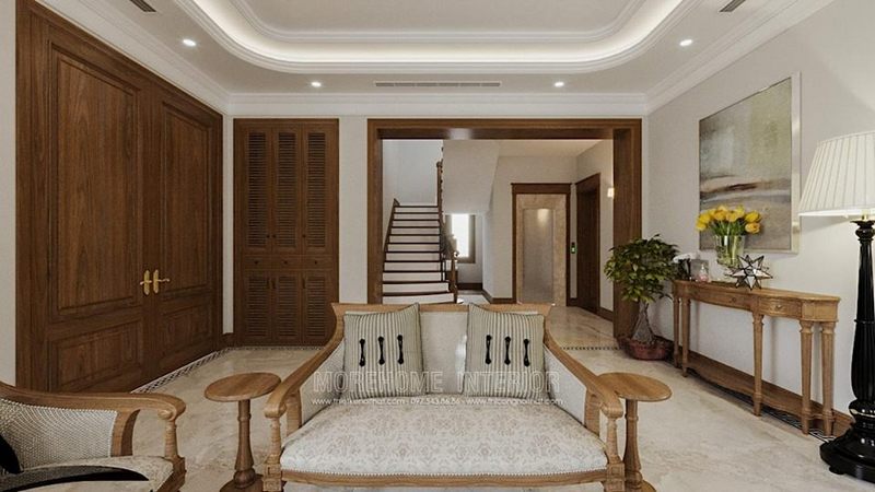 Mẫu thiết kế phòng khách biệt thự theo phong cách Indochine với nội thất gỗ tự nhiên sơn đen kết hợp nỉ sọc cao cấp