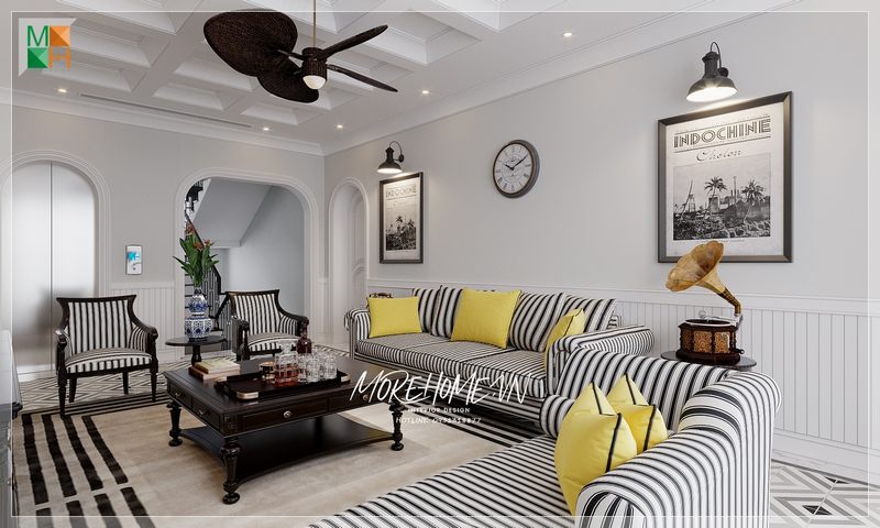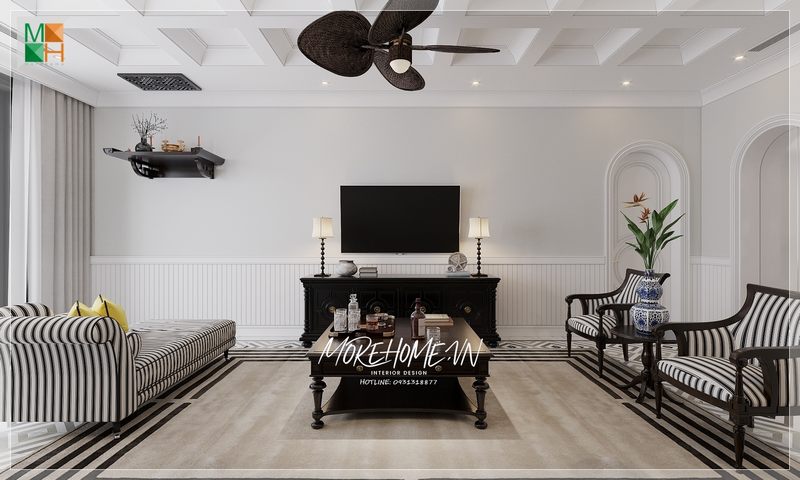 Nếu bạn đã cảm thấy nhàm chán với những màu sắc sofa thông thường, hãy thử áp dụng ngay thiết kế này của Morehome nhé. Với bộ sofa gỗ tự nhiên sơn đen bọc nỉ kẻ sọc đen trắng chắc chắn sẽ làm không gian phòng khách nhà bạn trở nên nổi bật