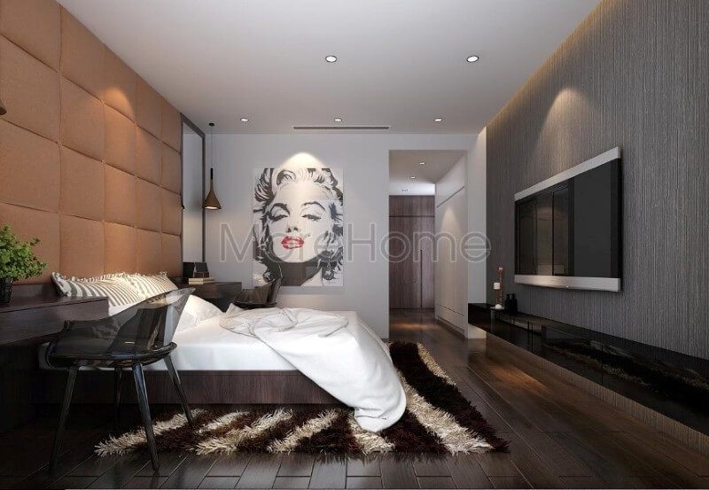 Mẫu giường ngủ chung cư đẹp bọc da đầu giường màu nâu mang đến cảm giác sang trọng cho căn phòng ngủ của gia chủ