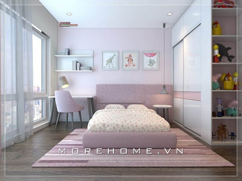 Nội thất phòng ngủ bé gái hiện đại, giường ngủ bọc vải hiện đại được bố trí tạo điểm nhấn ấn tượng cho cả không gian phòng ngủ của con