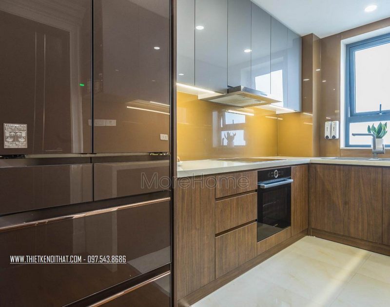 Không gian bếp được lấy cảm hứng từ màu nâu đất ấm giúp tạo ra một cảm giác hài hòa về màu sắc.