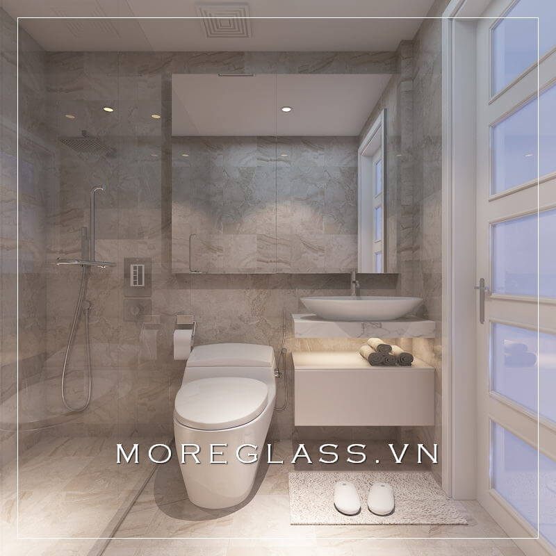 Mẫu thiết kế phòng tắm nhỏ gọn tông trắng sáng tinh kết hợp nội thất thông minh và phòng tắm kính cường lực cao cấp