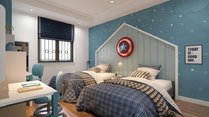 Phòng ngủ của con trai được trang trí theo mẫu bố trí nội thất phù hợp với sở thích của con. Tường được giản nền bằng giấy dán tường tựa như những vì sao trên bầu trời xanh, giường được tựa vào tường gỗ và điểm đặc biệt là hình ngôi nhà trên tường. Morehome cung cấp nhiều ý tưởng độc đáo trong bố trí nội thất phòng trẻ em trên website: thietkenoithat.com.