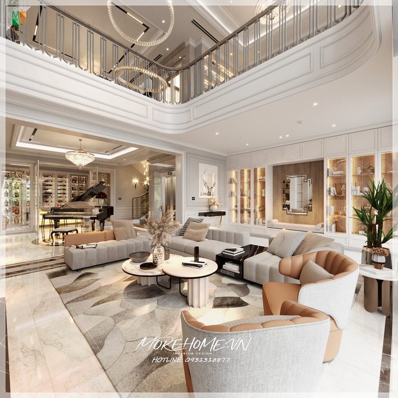 Phòng khách với gam màu trắng chủ đạo cùng với những điểm nhấn nội thất được lựa chọn hợp lí, không quá rườm rà, góp phần tạo nên cảm giác ấm cúng và hài hòa.